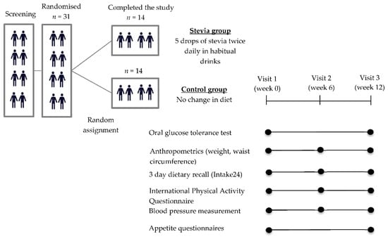 The participants in the stevia group were given a commercially available stevia drops product (SweetLeaf Stevia Sweet Drops Clear, SweetLeaf®, Wisdom Natural Brands, Arizona, USA) and were instructed to consume 5 drops twice daily with their habitual drinks (5 drops of stevia corresponds to the sweetness of one teaspoon of table sugar). The choice of stevia drops over any other powder product was taken based on the purity of the drops, containing only stevia leaf extract in water, as in most commercially available powder product stevia is usually mixed with a bulking agent (erythritol, inulin etc.), and therefore any effects shown would not be indicative solely of stevia. The participants were advised to use the stevia drops with their coffee, tea, smoothie, porridge, juice, or other beverage according to their preferences, ideally before lunch and before dinner. Advice on sugar consumption was not given. The participants allocated to the control group were not required to change anything in their usual diet. Both groups were advised to keep their physical activity levels consistent for the duration of the study and to avoid consuming any products containing NNS.