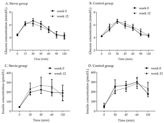 There were also no significant differences in insulin response among the study groups, and no significant main effect of the treatment group or interaction between the treatment group and session (week 0 and week 12). The week 0 and week 12 serum insulin values are presented in Figure 2 (panels C and D). The iAUC for insulin response to the OGTT was 16.5 ± 3.59 nmol/L × min at baseline and increased to 19.3 ± 5.88 nmol/L × min at week 12; however, this increase was not statistically significant (p = 0.516, paired samples t-test), as it was driven by two single subjects. Similarly, there was no difference in iAUC for insulin response in the control group at baseline and after 12 weeks, and the values were 21.6 ± 3.55 and 20.4 ± 4.07 nmol/L × min, respectively. The peak insulin concentration was 336 ± 78.9 pmol/L at baseline in the stevia group and 347 ± 95.9 pmol/L at week 12; in the control group, these values were 362 ± 62.8 and 367 ± 63.5 pmol/L, respectively.
