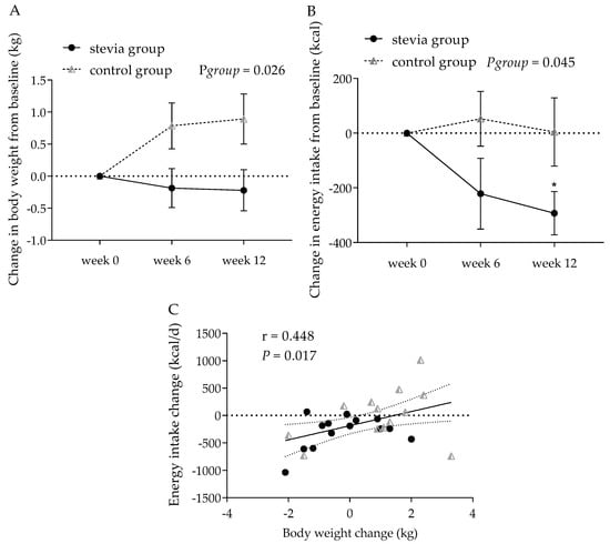 Change in body weight (A) and energy intake (B) in the stevia and control groups over 12 weeks (n = 14 in each group). Differences in body weight were correlated with changes in energy intake (C). Data are expressed as means ± SE. * p = 0.003.