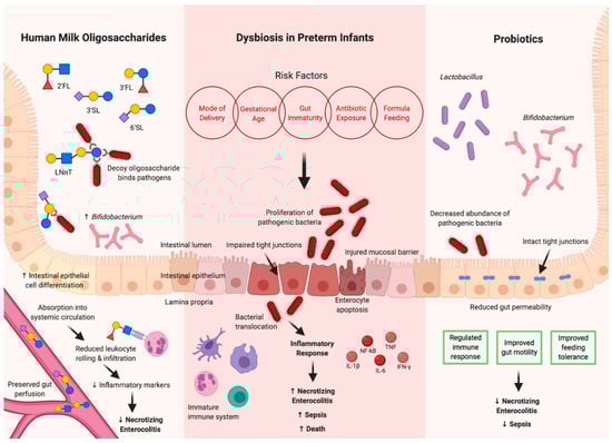 Effects of dysbiosis on the intestinal barrier in preterm infants and the protective effects of human milk oligosaccharides and enteral probiotics. Figure created with Biorender.com.