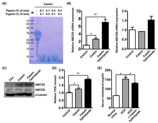 Casein hydrolysates regulate hyperlipidemia and enhance trans-intestinal cholesterol excretion (TICE). (A) The hydrolysis of the casein by pepsin and trypsin was validated by Coomassie Blue staining. Pepsin and trypsin were treated at a concentration as described and optimal enzymatic environment. (B,C) The mRNA or protein expression of ABCG5 and ABCG8 were assessed by qRT-PCR or Western blot analysis, respectively, in Caco-2 cells treated with casein or casein hydrolysates (2 mg/mL). (D) The amount of in vitro TICE was assessed using trans-well chamber and cholesterol assay following casein and casein hydrolysate treatment. (E) Alterations of serum cholesterol level of mice fed with high-cholesterol diet (HCD) or/and casein hydrolysates (250 mg/kg/day) were assessed by cholesterol assay. * p < 0.05, ** p < 0.01.