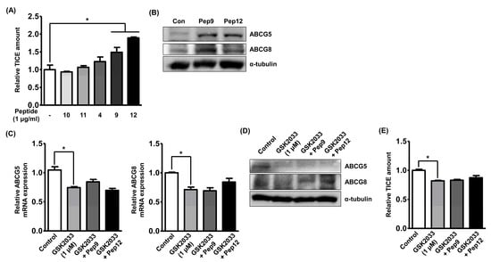 Bioactive peptide enhances TICE through activation of LXRα. (A) The amount of in vitro TICE was assessed by cholesterol assay in Caco-2 cells following treatment of synthetic peptides. (B) The alterations of protein expression of ABCG5 and ABCG8 were assessed by Western blot analysis following treatment of peptide 9 or 12. (C,D) The alterations of mRNA and protein expression of ABCG5 and ABCG8 were assessed by qRT-PCR or Western blot analysis, respectively, in Caco-2 cells following treatment of GSK2033 at a concentration of 1 μM and peptide 9 or 12. (E) The amount of in vitro TICE was assessed by cholesterol assay in Caco-2 cells following treatment of GSK2033 at a concentration of 1 μM and peptide 9 or 12. * p < 0.05.