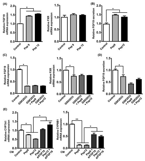 Enterocyte-derived FGF19 alters bile acid synthesis in the liver. (A) The alteration of mRNA expression of FGF19 and FXR was assessed by qRT-PCR in Caco-2 cells following treatment with peptide 9 or 12. (B) The alteration of secretory FGF19 level in conditioned media (CM) of Caco-2 cells was assessed by ELISA following treatment with peptide 9 or 12. (C) The alteration of mRNA expression of FGF19 and FXR was assessed by qRT-PCR in Caco-2 cells following treatment of GSK2033 and peptide 9 or 12. (D) The alteration of secretory FGF19 level in CM of Caco-2 cells was assessed by ELISA following treatment with GSK2033 and peptide 9 or 12. (E) The alteration of mRNA expression of CYP7A1 and CYP8B1 was assessed by qRT-PCR in MIHA cells following treatment with 4x concentrated CM from Caco-2 cells treated with peptide 9 or 12 and siRNA against mRNA of FGF19. * p < 0.05, ** p < 0.01.