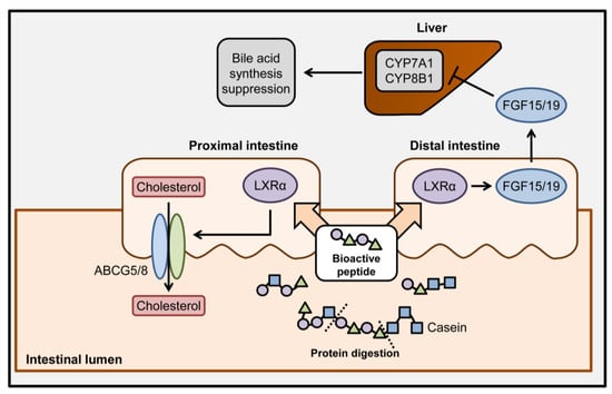 As patients with hyperlipidemia and its related complications have increased globally, hyperlipidemia has become a major problem that needs to be resolved through innovative clinical research. Recently, the induction of TICE has been suggested as a promising therapeutic strategy that could be combined with another hyperlipidemic treatment [10]. In this study, we suggested two specific casein-derived peptides (SQSKVLPVPQK for peptide 9 and HPHPHLSF for peptide 12) that could induce TICE through the activation of the LXRα signaling pathway and the induction of ABCG5 expression (Figure 6). Furthermore, FGF15/19 secretion from enterocytes was induced by the peptides, which decreased hepatic bile acid synthesis to alter the hepato-biliary cholesterol homeostasis. These results suggest that dietary proteins demonstrate bioactivity through the generation of peptides during digestive hydrolysis and may be involved in the maintenance of systemic cholesterol homeostasis.