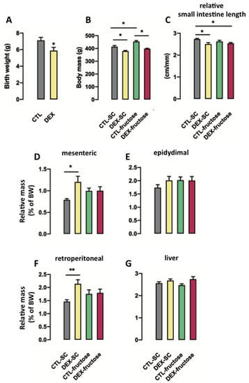 3.1. Consumption of Fructose by Rats Born to DEX-Treated Mothers Modifies Body Composition but Does Not Modulate Small Intestine Length