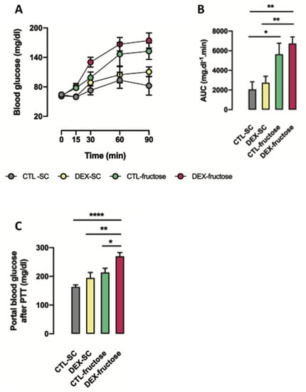 Whole-body and intestinal use of pyruvate as a gluconeogenesis substrate by rats exposed to dexamethasone (DEX) in utero and treated with fructose during adult life. The 40 h fasted rats received an i.p. injection containing sodium pyruvate. The blood from the tail was collected before and 15, 30, 60, and 90 min after intraperitoneal (i.p.) injection for glucose measurements (A) and the area under the curve (AUC) was calculated above each individual baseline (B). Glucose levels were also measured in portal blood at the end of the pyruvate tolerance test (PTT) (C). Results are presented as mean ± standard error of the mean (S.E.M.) * p < 0.05, ** p < 0.01, **** p < 0.0001 (n = 8). Offspring born to control (CTL) mothers that received only standard chow (SC) and tap water during adult life (CTL-SC); offspring born to DEX-treated mothers that received only SC and tap water during adult life (DEX-SC); offspring born to CTL mothers that received SC plus 10% fructose during adult life (CTL-fructose); and offspring born to DEX-treated mothers that received SC plus 10% fructose during adult life (DEX-fructose).