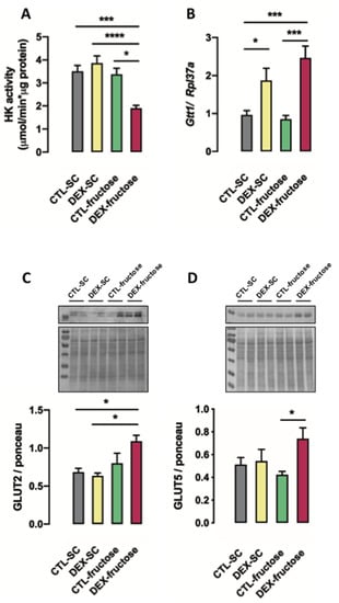 3.5. Rats Born to DEX-Treated Mothers That Consume Fructose during Adulthood Display Reduced HK Activity and Increased GLUT5 and GLUT2 Expression in the Jejunum