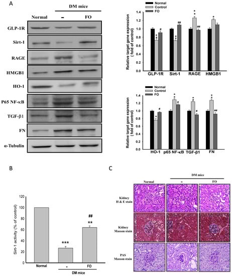 In accordance with these results obtained from the in vitro study, administration of oligo-FO effectively increased the protein levels of Sirt-1, GLP-1R, and HO-1, as well as Sirt-1 activity, but inhibited NF-κB activation and HMGB1/RAGE/TGF-β1/FN cascade in the kidney of diabetic mice (Figure 5A,B). As expected, the renal histological changes and dysfunction evidenced by a significant elevation in the urine levels of BUN, creatinine, and albumin that occurred in the diabetic mice were markedly improved by oligo-FO treatment (Figure 5C and Figure 6A).