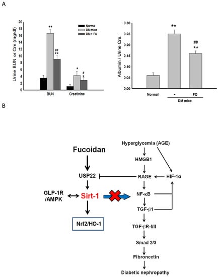 The effects of fucoidan on urine levels of BUN, creatinine, and albumin, in diabetic nephropathy mice. After treatment with fucoidan (1) (300 mg/kg, p.o.) for 6 weeks, the urine levels of BUN, creatinine, and albumin were examined in different groups (A). Results were expressed as the mean ± SEM (n = 8). * p < 0.05, ** p < 0.01 vs. normal mice; # p < 0.05, ## p < 0.01 vs. untreated diabetic mice. The proposed schematic diagram of the protective effect of fucoidan against diabetic nephropathy (B).