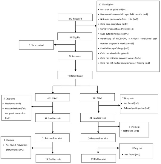The study profile is shown in Figure 1. A total of 143 women were screened for eligibility. Of these, 62 were excluded mainly due to the child’s lack of previous exposure to nuts (n = 34), caregiver or a member of her family being a beneficiary of PROSPERA (n = 22), reported food allergy or family history of allergies (n = 11) and/or child prematurity (n = 11). Of the 81 eligible women, 3 were not recruited because they either declined to participate (n = 2) or reported that their husbands did not like visitors coming into their home. Women (n = 78) were recruited (signed informed consent) and randomly assigned to SQ-LNS groups; 40 to LNS-U group and 38 to the LNS-S group. Of these, 62 completed the initial exposure visit and 59 completed the final exposure visit (LNS-U, 30; LNS-S, 29). A total of 56 had complete information on food mixture consumption at initial and final exposure and were included in the present analysis. The reasons for loss to follow-up during the study are detailed in Figure 1.