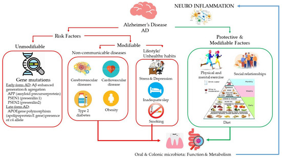 Considering the limited efficacy of current therapies, medical or psychological, for neurologic disorders (such as AD), the discovery of new mediators and moderators of these disorders, such as the oral and gut microbiome as well as the interactions with the diet and the lifestyle may open new diagnostic, preventive and nutritional and pharmaceutical therapeutic avenues for mental conditions and, particularly, for AD.
