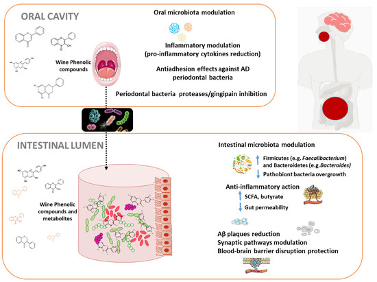 Red wine is one of the richest sources of polyphenols in the diet. In particular, red wine provides a unique and very diverse combination of phenolic structures including flavonols, flavan-3-ols and anthocyanins, among the flavonoid compounds, and hydroxybenzoic and hydroxycinamic acids, phenolic alcohols and stilbenes, among the non-flavonoids. Taking into account that the influence of wine polyphenols on human microbiota is becoming widely recognized, and many new studies about microbiota and AD have been reported over last few years, we want to place a special emphasis on studies that comprehensively explore, from an integral perspective, the connection between modulation of oral and intestinal microbiota by wine polyphenols, and the derived consequences in AD (Figure 2).