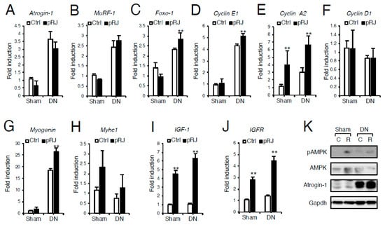 pRJ increased regeneration gene expression but does not influence atrophy gene expression. (A–J) qPCR analysis of mRNA levels of Atrogin-1 (A), Murf1 (B), Foxo-1 (C), Cyclin E1(D), Cyclin A2 (E), Cyclin D1 (F), Myogenin (G), Myhc1(H), IGF-1(I), or IGF receptor (IGFR)(J) in sham or denervated muscle with or without 1% pRJ feeding. Western blotting analysis showed the protein levels of pAMPK, AMPK, Atrogin-1, and Gapdh in sham or denervated muscle with or without 1% pRJ feeding (K). Data are mean ± SD (n = 7). ∗∗p < 0.01, ∗p < 0.05, versus control (Ctrl).