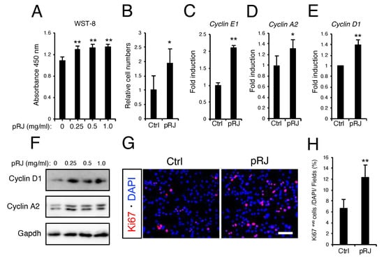 pRJ stimulates proliferation of myoblasts in C2C12 cells. (A–B) C2C12 cells were treated with 0. 0.25, 0.5, or 1.0 mg/mL pRJ solution for 2 days. The number of living cells was assessed using Cell Counting kit-8. Cells were treated with 1.0 mg/mL pRJ for 2 days. After staining with trypan blue, the number of living cells was determined by direct counting. Graphs show the ratio of number of cells treated with pRJ divided by control (B). (C–E) The mRNA levels of indicated genes in cells treated with or without 1.0 mg/ml pRJ for 2 days. (F) Western blot showing protein levels of Cyclin D1, Cyclin A2, or Gapdh in C2C12 cells treated with 0. 0.25, 0.5, or 1.0 mg/mL pRJ solution for 2 days. (G and H) Images of Ki67 positive (+ve) immunostaining in cells treated with or without 1.0 mg/mL pRJ (G). The graph indicates the number of Ki67+ve cells as a percentage of total cells stained with DAPI (H). Images are representative of multiple independent experiments (F and G). Scale bar corresponds to 100 μm (G). Data are mean ± SD (n = 4). ∗∗p < 0.01, ∗p < 0.05, versus control (Ctrl).