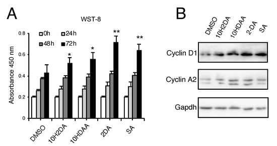 Protease-treated royal jelly treatment for 48 hours increased the number of cells (Figure 3A,B) as well as the expression of cell-cycle-related genes (Figure 3C–F). Furthermore, Ki67 immunostaining showed that pRJ treatment increased the number of Ki67-positive proliferative cells (Figure 3G,H). Trans-10-hydroxy-2-decenoic acid and 10-hydroxydecanoic acid are two fatty acids specifically occurring in RJ. Trans-10-hydroxy-2-decenoic acid and 10-hydroxydecanoic acid can be metabolized into 2DA and SA, respectively [41]. To determine whether RJ-derived fatty acids and/or their metabolic products affect proliferation, C2C12 cells were treated with the indicated compounds for 24, 48, and 72 hours, after which cell numbers were quantified by WST-8. As shown in Figure 4A, 10H2DA, 10HDAA, 2DA, and SA all significantly increased cell proliferation (Figure 4A). These RJ-related fatty acids also increased the protein levels of cell cycle genes such as Cyclin D1 and Cyclin A2 (Figure 4B).