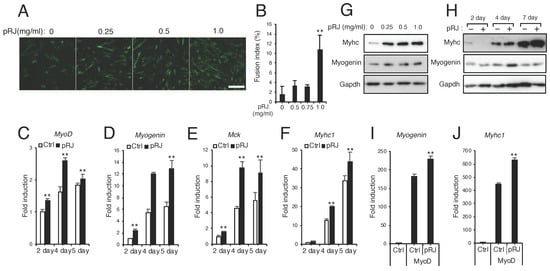 pRJ stimulates myoblast differentiation. (A,B) C2C12 cells were treated with myogenic medium supplemented with pRJ at 0, 0.25, 0.5, or 1.0 mg/mL for 6 days. Cells were then stained with anti-myosin heavy chain antibody (A). Fusion index was quantified as the number of nuclei (at least three) within myotubes divided by the total number of nuclei (B). (C–F) Cells were treated with myogenic medium together with or without 1 mg/ml pRJ for 2, 4, or 5 days. mRNA levels of the indicated myogenic markers were determined by qPCR. (G and H) C2C12 cells were treated with myogenic medium supplemented with pRJ at 0, 0.25, 0.5, or 1.0 mg/mL for 4 days (G) or treated with 1 mg/mL pRJ for 2, 4, or 7 days (H). Western blots showing protein levels of myosin heavy chain (Myhc), Myogenin, or Gapdh (G and H). (I and J) C3H10T1/2 cells were transfected with or without MyoD and then treated with or without 1mg/mL pRJ. mRNA levels of Myogenin or Myhc1 were determined on day 2 by qPCR. Representative images are shown. Scale = 100 μm (A, G, and H). Data are mean ± SD (n = 4). ∗∗p < 0.01, ∗p < 0.05, versus control (Ctrl).