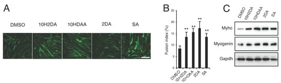 Finally, we examined the effect of pRJ and RJ-related fatty acid products on myoblast differentiation. C2C12 cells were induced to differentiate in the presence or absence of pRJ. Myosin heavy-chain immunostaining showed that pRJ treatment led to an increase in myotube formation compared to control treatment cells (Figure 5A,B). Furthermore, pRJ treatment elevated the expression level of muscle differentiation genes such as MyoD, Myogenin, Mck, or Myhc1 (Figure 5C–H). C3H10T1/2 cell model is a mouse embryonic fibroblast cell line with myogenic potential. C3H10T1/2 cells, however, do not normally express MyoD, a master regulator of myogenesis [42]. To evaluate the effect of pRJ on MyoD function, we overexpressed MyoD in C3H10T1/2 cells and then treated the cells with or without pRJ. qPCR analysis revealed that pRJ treatment enhanced the induction of Myogenin and Myhc1 induced by MyoD (Figure 5I,J). Treatment with 10H2DA, 10HDAA, 2DA, and SA increased myotube formation (Figure 6A,B). The treatment of cells with these RJ-related fatty acids increased the protein levels of myogenic differentiation marker genes such as Myhc and myogenin (Figure 6C).