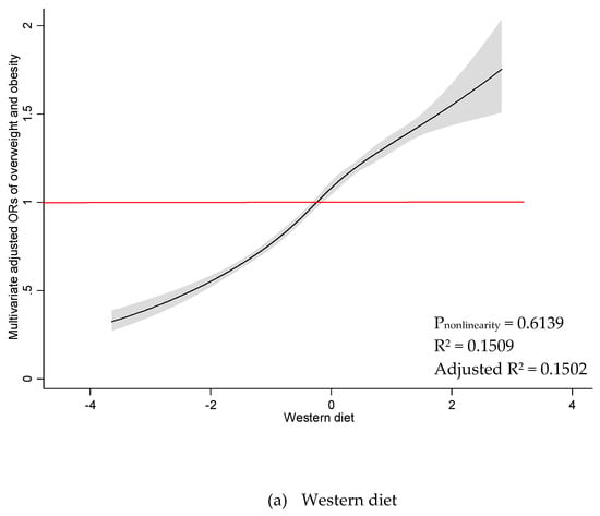 Although the causes of obesity are likely to be multifactorial, diet plays an important role. Western diet could be an important contributory factor. Both trend and dose–response analyses showed linear association between the Western diet and odds of overweight/obesity among women. Higher odds of overweight/obesity were reported among women who scored a Western diet score above a mean of zero. This could be explained by the fact that those with a Western diet score greater than zero had shifted their energy intake from carbohydrates toward protein (data not shown). Animal-based proteins such as red meat and processed meat were reported to be associated with the development of obesity [33,34,35]. Higher intake of animal protein may have a major impact on the increased odds of overweight/obesity in the Western diet. Although the trend and dose–response analyses yielded contradictory linearity results, both analyses showed positive directions. A weak linear correlation was observed in the linear analysis, which may indicate a nonlinear association. No threshold at which a higher Western diet score was linked to odds of overweight/obesity among men was observed. Generally, higher adherence to the Western diet was associated with higher energy intake, which explained weight gain and increased risks of overweight and obesity.