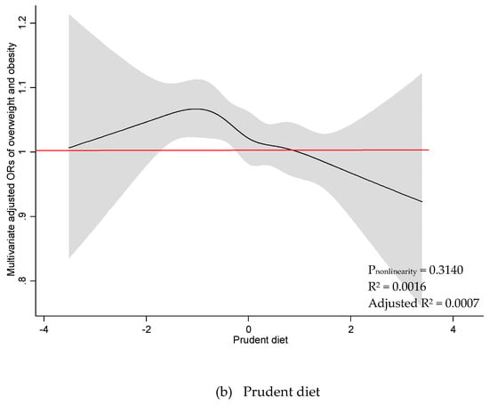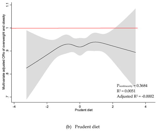 Restricted cubic spline plots between dietary patterns and multivariate adjusted odds ratio of overweight and obesity among all participants. (a) Western diet and (b) Prudent diet. Results obtained by multivariable logistic regression with restricted cubic splines with five knots. Solid black lines indicate odds ratio, and shaded areas indicate 95% CI.