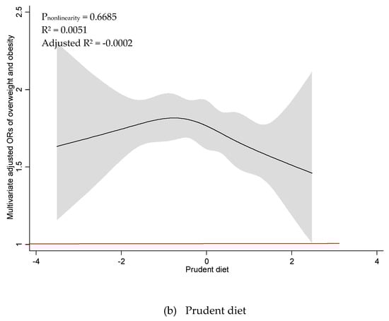 In the trend analyses, a significant positive trend was observed for all participants and men. These findings were in agreement with the nonlinear model. There was a discrepancy between the linear and nonlinear model between the Prudent diet and odds of overweight/obesity for women. Previous studies have reported that high vegetable and fruit intake was inversely associated with body weight [36,37,38]. However, no association between vegetable intake and risk of overweight or obese was observed in other studies [34,39,40]. Higher adherence to the Prudent diet in the current study may not have a significant impact on overweight/obesity even though it was loaded with pulses, legumes, green leafy vegetables, cruciferous vegetables, other vegetables, root vegetables, starchy vegetables, mixed vegetables, vegetable soups, and fruits. The observed Prudent diet was high in total calorie, which may lead to overweight/obesity. An examination of the nutrient composition revealed an increase in total calories consumed with higher adherence to the Prudent diet, with total fat being the dominant source of calories (data not shown). This could be explained by the heterogeneity of our local food culture, where the use of palm oil and coconut milk in cooking is common, which contributed to an increase in overall calories from fat in the diet. In addition, women may be more concerned with diet quality, having high adherence in the Prudent diet, but not in the total calorie of the diet. Although linear associations were reported in the linear models for all participants and men, weak adjusted R-squared values indicated the Prudent diet has a low variance effect on the odds of overweight/obesity. A weak adjusted R-square value indicated the Prudent diet has a low variance effect on the odds of overweight/obesity for all participants as well as among women. In summary, the effect of a Prudent diet on overweight and obesity status maybe less apparent in the current study.
