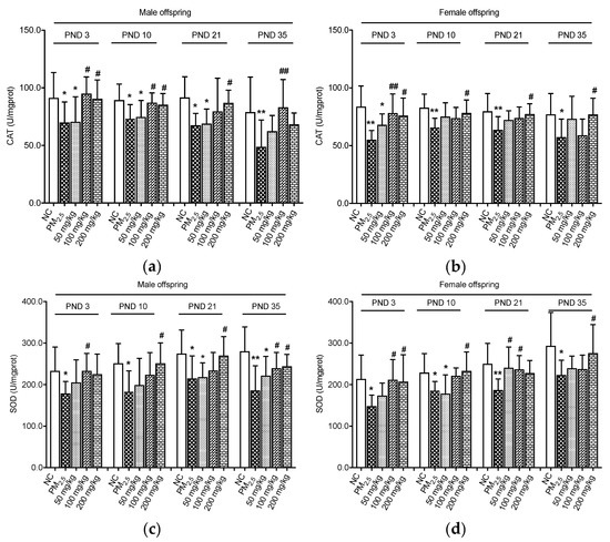 Activities of CAT and SOD of the offspring on PND 3, 10, 21, and 35 were assayed (Figure 2). It was evident that for male offspring, CAT levels in the PM2.5 groups were lower than those in the NC groups (p < 0.05, Figure 2a). On PND 3 and 10, the CAT levels were significantly elevated in the 100 and 200 mg/kg quercetin groups as compared with male samples in the PM2.5 group (p < 0.05). On PND 21, CAT concentrations of male offspring in the 200 mg/kg quercetin group were higher than those of the PM2.5 group (p < 0.05). The same effect was observed in male offspring in the 100 mg/kg quercetin group on PND 35 (p < 0.05). As shown in Figure 2b, the activity of CAT in the female offspring was significantly decreased in the PM2.5 groups compared with the NC groups (p < 0.05). Supplementation with quercetin at the doses of 100 and 200 mg/kg increased CAT activity compared with the PM2.5 group on PND 3 (p < 0.05). Moreover, 200 mg/kg quercetin administration significantly elevated the CAT of female offspring compared with the PM2.5 group on PND 10, 21, and 35 (p < 0.05).
