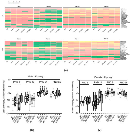 Axonomic composition of gut microbiota. (a) Axonomic composition of the top 20 genera; (b) Bacteroides of male offspring mice; (c) Bacteroides of female offspring mice. Compared with the NC group, * indicates p < 0.05. Compared with the PM2.5 group, # indicates p < 0.05.
