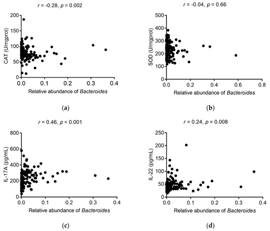 Correlation between Bacteroides and inflammation and oxidative indicators. (a) Correlation between Bacteroides and CAT; (b) Correlation between Bacteroides and SOD; (c) Correlation between Bacteroides and IL-17A; (d) Correlation between Bacteroides and IL-22. Spearman’s correlation analysis was used to analyze the relationship.