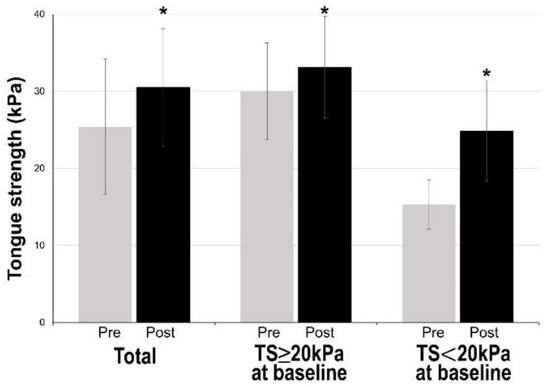 Changes in tongue strength before and after the intervention. Tongue strength after the intervention was 30.47 ± 7.64 kPa, which was significantly increased compared with that at baseline (p < 0.001). In the patient groups classified according to tongue strength at baseline ≥20 kPa and <20 kPa, tongue strength after the intervention was 33.10 ± 6.64 kPa and 24.79 ± 6.64 kPa, respectively, and it was significantly increased compared with tongue strength at baseline (p < 0.001) in both groups. Abbreviations: TS, tongue strength; * p < 0.001 by paired t-test.
