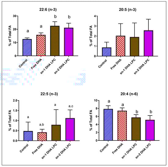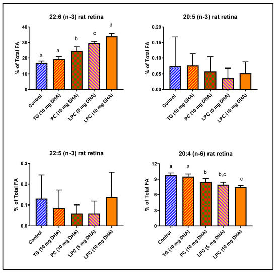Figure 1. Incorporation of dietary DHA fed in the form of PC, TAG, or LPC into rat retinal lipids. Normal male Sprague-Dawley rats (8-week-old; n = 5 per group) were gavaged daily with 10 mg DHA in 250 µL corn oil in the form of TAG-DHA, di-DHA PC, or LPC-DHA for 30 days. In addition, a half-dose of LPC-DHA (5 mg DHA) was used to be comparable to the amount of LPC-DHA expected to be generated by di-DHA PC during digestion. All animals were on regular rodent chow that contained no DHA, but contained 17.4 mg α-linolenic acid (18:3, n-3) per g of chow. Retinal FA were analyzed by GC/MS as described in the text. The percent composition of 20:4 (n-6), 20:5 (n-3), 22:5 (n-3), and 22:6 (n-3) are shown here. The total FA composition is shown in Table 1. The significance of differences between the treatment groups was determined by a one-way ANOVA, with Tukey multiple post-hoc test (Graphpad Prism 8.0). Bars without common superscripts are significantly different from each other (p < 0.05). TG: triacylglycerol; PC: phosphatidylcholine; LPC: lysophosphatidylcholine; FA: fatty acid; GC/MS: gas chromatography/mass spectroscopy.