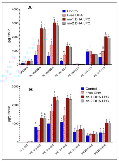 Figure 3. Molecular species of mouse retinal phospholipids containing DHA. The animals were gavaged with free (unesterified) DHA or two isomers of LPC-DHA as described under Figure 2. The molecular species of PC (A) and PE (B) which contain DHA were analyzed using multiple reaction monitoring by LC/MS/MS, as described in the text, using 17:0 LPC, 17:0–17:0 PC, and 17:0–17:0 PE as internal standards. Bars without common superscripts are significantly different from each other by a one-way ANOVA, and Tukey post-hoc analysis (mean ± SD), 6 animals/group). PE: phosphatidylethanolamine; PC: phosphatidylcholine; sn-1 and sn-2: stereospecific numbering 1 and 2 respectively; DHA: docosahexaenoic acid; LC/MS/MS: liquid chromatography/tandem mass spectroscopy; SD: standard deviation; LPC: lysophosphatidylcholine; DHA: docosahexaenoic acid.