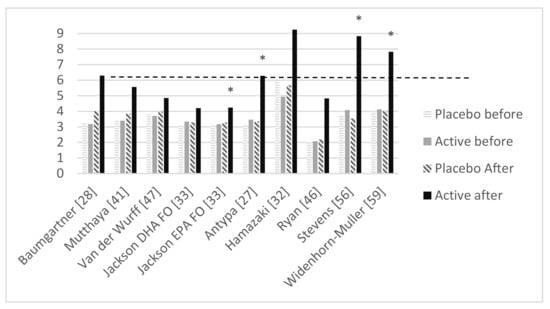 | Stevens [56] | 480 mg DHA, 80 mg EPA | Eryth membranes | - | 4.08 | 3.78 | 8.83 | 3.53 | 4.75 | −0.25 | Y |