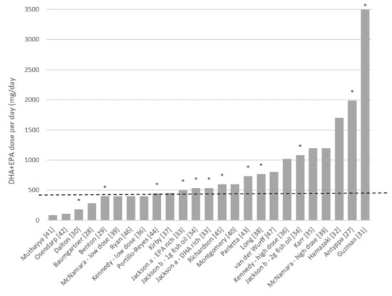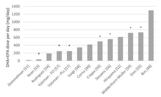 - Meyer, B.J.; De Groot, R.H. Effects of Omega-3 Long Chain Polyunsaturated Fatty Acid Supplementation on Cardiovascular Mortality: The Importance of the Dose of DHA. Nutrients 2017, 9, 1305. [Google Scholar] [CrossRef]