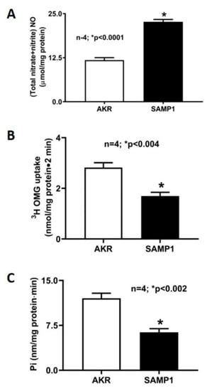 Physiological consequences of chronic intestinal inflammation in SAMP1 mouse. (A) Nitric oxide (NO): Mucosal levels of NO are significantly increased in SAMP1 mouse intestine. (B) Na-glucose co-transport (SGLT1): Na-dependent and phlorizin-sensitive 3H-OMG uptake is significantly decreased in villus cells from the SAMP1 intestine. (C) Na+/K+-ATPase: The activity of Na+/K+-ATPase, which provides the favorable Na gradient for SGLT1, is significantly diminished in SAMP1 mice intestine.