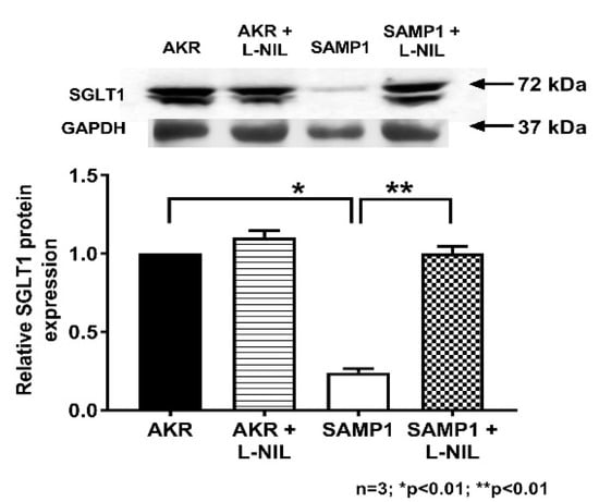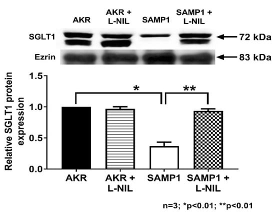 SGLT1 mRNA expression was significantly reduced in SAMP1 mice villus cells compared to AKR. Inhibition of iNO by L-NIL reversed the inhibition of SGLT1 mRNA expression in SAMP1 mice villus cells. However, L-NIL did not alter the SGLT1 mRNA expression in AKR mice (Figure 7). This result reveals that iNO mediated inhibition of SGLT1 is likely through altered mRNA expression.