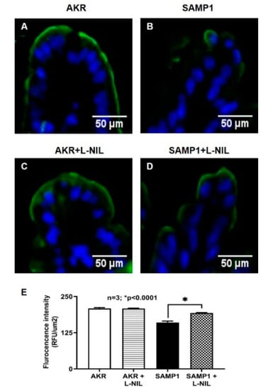 To further confirm the molecular mechanism of inhibition of SGLT1 protein expression, immunofluorescence studies were performed. Images were captured at 10X magnification. Figure 10A shows SGLT1 in AKR mice intestine, demonstrating its abundance in the BBM of villus cells lining the villus. However, as shown in Figure 10B, SGLT1 protein expression was markedly decreased in SAMP1 mice ileal villus cells. But, L-NIL treatment reversed this decrease to normal levels comparable to that from AKR mice (Figure 10D). Moreover, L-NIL treatment did not change SGLT1 protein levels in AKR mice villus cells (Figure 10C). The quantitation of SGLT1 fluorescence levels confirmed these findings (Figure 10E).