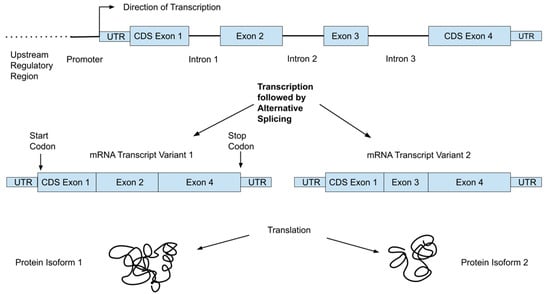 The human genome consists of over 3 billion DNA base-pairs organized into chromosomes and present in the nuclei of most of our cells in two copies: one from each parent. It encodes the proteins our bodies need in linear units of information called genes, of which there are about 21,000 [7]. Genes occupy only a small fraction (<1%) of the genome; the rest includes “regulatory machinery”—regions that are important for controlling the transcription of various genes—as well as repetitive regions and large regions with unknown function(s) [7]. Transcriptional machinery “reads” the DNA code and produces mRNA. This mRNA then moves to ribosomes, where it interacts with translational machinery to link amino acids into the encoded proteins. Figure 1 shows an example of the organization of a typical gene, which consists of multiple regions referred to as exons and introns. While both are initially transcribed, spliceosomes remove the intronic regions, such that only exons are present in the mature mRNA transcripts. In addition, a single gene can produce multiple transcripts that each only contain certain exons, allowing single genes to encode multiple protein isoforms [8]. For reference, we provide a glossary of common genetic terms with simple explanations in Table 1.