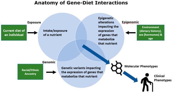 There are several components of human diets, particularly the Modern Western Diet (MWD), which, when combined with the impact of diverse genetics on the metabolism of certain nutrients, have the capacity to give rise to harmful gene–diet interactions [23]. These interactions affect the expression of metabolism-associated genes, which impact quantities or activities of enzymes that synthesize or catabolize that nutrient. Ultimately, this has the capacity to alter molecular phenotypes (levels of bioactive nutrient products and their metabolites) and clinical phenotypes including human disease.