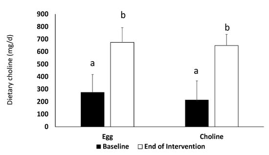 As expected, choline intake significantly increased from baseline to end of intervention for both egg and supplement periods (p < 0.001) (Figure 1).