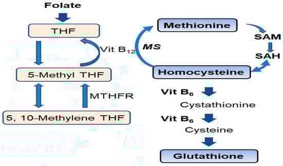 As a homologue of cysteine, homocysteine (Hcy) is an intermediate in methionine metabolism (Figure 1) []. In one-carbon metabolism, folate is cofactor and vitamin B12 is a co-enzyme that promotes the remethylation of Hcy. Hcy is converted to cystathionine by vitamin B6. Thus, if folate is deficient, hyperhomocysteinemia (HHcy) can develop [,]. Vitamin B12 or B6 deficiencies can also cause HHcy (Figure 1). Hcy induces a high S-adenosylhomocysteine (SAH) level, which inhibits S-adenosylmethionine (SAM)-dependent methylation reactions (Figure 1) [].