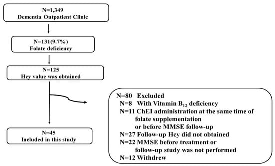 Flow chart detailing the derivation of the study sample. Of such patients, homocysteine (Hcy) was evaluated in 125 patients. Among them, 80 patients were excluded for the reasons described below: accompanying vitamin B12 deficiency (N = 8), choline esterase inhibitor (ChEI) administration at the same time as folate supplementation or before MMSE follow-up (N = 11), follow-up Hcy did not obtained (N = 27), MMSE before treatment or follow-up study was not performed (N = 22), or withdrew from the study (N = 12). In total, 45 patients were enrolled in this study.