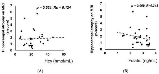 Plasma homocysteine (Hcy) levels or folate levels and the degree of hippocampal atrophy were not significantly correlated. There were no significant correlations between baseline Hcy levels and baseline hippocampal atrophy as estimated by the z-score produced by the voxel-based specific regional analysis system developed for the study of Alzheimer’s disease (VSRAD) (p = 0.521, Rs = 0.124). (A) The folate concentration and hippocampal atrophy based on the VSRAD z-score were not significantly correlated (p = 0.069, R = 0.343). (B) Spearman’s rank correlation coefficient was used for analysis because the data deviated from a normal distribution.