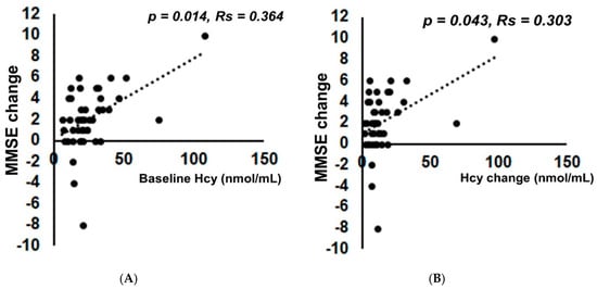 There was a significant positive correlation between MMSE score improvement after folate supplementation and the baseline homocysteine (Hcy) level or its reduction. (A) The degree of improvement of the MMSE score by folate supplementation and baseline homocysteine (Hcy) level were significantly correlated (p = 0.014, Rs = 0.364). (B) The degree of improvement of the MMSE score by folate supplementation and baseline Hcy reduction were significantly correlated (p = 0.043, Rs = 0.303). Spearman’s rank correlation coefficient was used for analysis because the data deviated from a normal distribution.