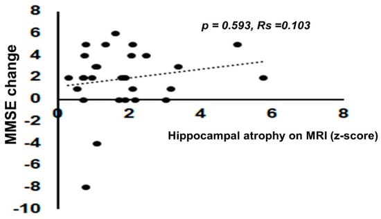 Of note, there was also a significant positive correlation between MMSE change and the Hcy change (p = 0.043, Rs = 0.303) (Figure 5B). There were no significant correlations between the degree of MMSE change by folate supplementation and the degree of hippocampal atrophy on MRI as estimated by the VSRAD z-score (p = 0.593, Rs = 0.103) (Figure 6). There was also no significant correlation between the degree of MMSE change by folate supplementation and degree of recovery of folate (Supplementary Figure S4). Long-term follow-up of the MMSE score at 6 months, 1 year, and 2 years later was performed by GLMM. Although the MMSE score decreased despite continued folate supplementation, it was gradual, as shown in Supplementary Figure S5.