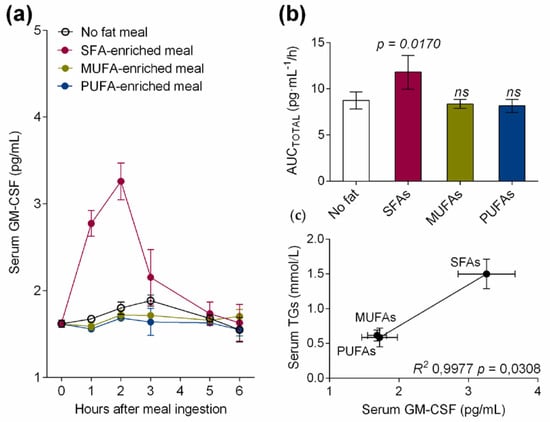 Serum from healthy volunteers was collected at fasting (TG concentration 0.42 ± 0.1 mmol/L) and at the postprandial hypertriglyceridemic peak (1–3 h) after SFA-enriched (TG concentration 1.54 ± 0.4 mmol/L), MUFA-enriched (TG concentration 0.65 ± 0.2 mmol/L), or PUFA-enriched (TG concentration 0.63 ± 0.2 mmol/L) meal ingestion. As depicted in Figure 1a, only the meal rich in SFAs postprandially increased serum GM-CSF levels when compared to the other fatty acid-enriched and no-fat meals. Thus, the total area under the curve (AUCTOTAL) values for serum GM-CSF were significantly higher (p = 0.0170) only after the ingestion of the high-fat meal enriched in SFAs in healthy volunteers (Figure 1b). Interestingly, serum GM-CSF levels, which is a DC maturation factor, were acutely increased by the SFA-enriched meal at the postprandial hypertriglyceridemic peak, suggesting that dietary fatty acids present in TRLs modulate the DC maturation process. In addition, serum TG correlated with the levels of serum GM-CSF in healthy volunteers (R2 0.9977, p = 0.0308, Figure 1c).