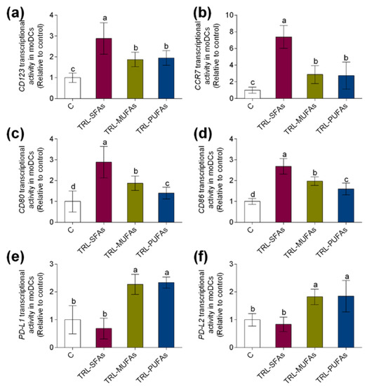 In vitro expression of dendritic cell (DC) gene markers in monocyte-derived DCs (moDCs) after stimulation with TRL-SFAs, TRL-MUFAs and TRL-PUFAs (TRL, triglyceride-rich lipoprotein) at 100 µg of TGs/mL for 6 days and in presence of GM-CSF and interleukin-4 (IL-4). DC maturation markers: (a) CD123 and (b) CCR7. DC pro-inflammatory activation markers: (c) CD80 and (d) CD86. DC tolerogenic activation markers: (e) PD-L1 and (f) PD-L2. Control means non-treated cells in the presence of GM-CSF and IL-4. Values are presented as means ± SD (n = 6) and those marked with different letters are significantly different (p < 0.05).