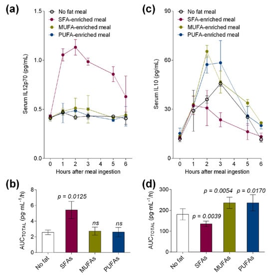 We also investigated the secretion levels of pro-inflammatory IL-12p70 and tolerogenic IL-10 in postprandial serum of healthy volunteers. After meal ingestion, postprandial serum levels of IL-12p70 (Figure 3a) were increased by the SFA meal but not by the MUFA or PUFA meal when compared to the control meal with no fat. Remarkably, IL-12p70 AUCTOTAL was particularly increased by the SFA meal (p = 0.0125, Figure 3b) over postprandial 6 h. In contrast, IL-10 levels were postprandially lower after the SFA meal (Figure 3c) and higher after the MUFA and PUFA meal ingestion. Thus, AUCTOTAL values for serum IL-10 were significantly lower (p = 0.0039) only after the ingestion of the high-fat meal enriched in SFAs and higher after the ingestion of the MUFA- (p = 0.0054) and PUFA- (p = 0.0170) enriched meals in healthy volunteers when compared to the control meal with no fat (Figure 3d).