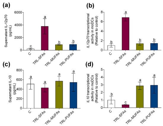In vitro expression and secretion of proinflammatory and tolerogenic cytokines in moDCs after stimulation with TRL-SFAs, TRL-MUFAs, and TRL-PUFAs at 100 µg of TGs/mL for 6 days and in presence of GM-CSF and IL-4. (a) IL-12p70 secretion and (b) mRNA expression. (c) IL-10 secretion and (d) mRNA expression. Values are presented as means ± SD (n = 6) and those marked with different letters are significantly different (p < 0.05).