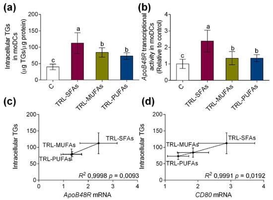 (a) Intracellular TGs accumulation and (b) In vitro apoB48R mRNA induced in moDCs after stimulation with TRL-SFAs, TRL-MUFAs and TRL-PUFAs at 100 µg of TGs/mL for 6 days and in presence of GM-CSF and IL-4. (c) Correlation between apoB48R mRNA and (d) CD80 mRNA (DC activation marker) with intracellular TGs in moDCs. Control means non-treated cells in presence of GM-CSF and IL-4. Values are presented as means ± SD (n = 6) and those marked with different letters are significantly different (p < 0.05). TGs: triglycerides.