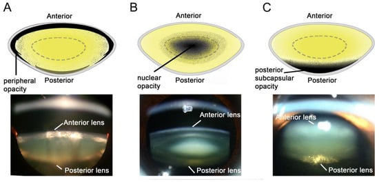 Cataracts can form in different parts of the lens with three main type of cataracts classified according to the location in which the cataract first forms; cortical cataract which manifests as an opacity in the peripheral edges of the lens, and is highest amongst diabetic patients (Figure 1A) [22,23], nuclear cataract where the cataract first occurs in the nucleus, or centre of the lens, and is typically associated with aging (Figure 1B) [24], and posterior subcapsular cataract, which forms in the back of the lens, and is often associated with the use of certain medications, including corticosteroids and diabetes medications (Figure 1C) [25,26]. In addition, patients can present with opacity in more than one area of the lens which can cause overlap in the classification of cataracts.
