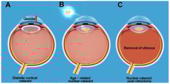 Schematic of the eye showing the development of (A) diabetic cortical cataract due to elevated levels of glucose, (B) age-related nuclear cataract due to UV exposure, and (C) nuclear cataract post vitrectomy due to depletion of vitamin C and elevated PO2 levels.